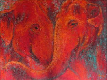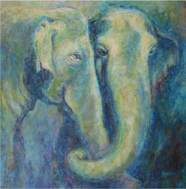balance of society and nature. The artist attempts to convey an ideal world where society reciprocates the manner in which nature supports life. Humanizing elephants, she conveys that such equilibrium can be attained if we peacefully coexist with nature without